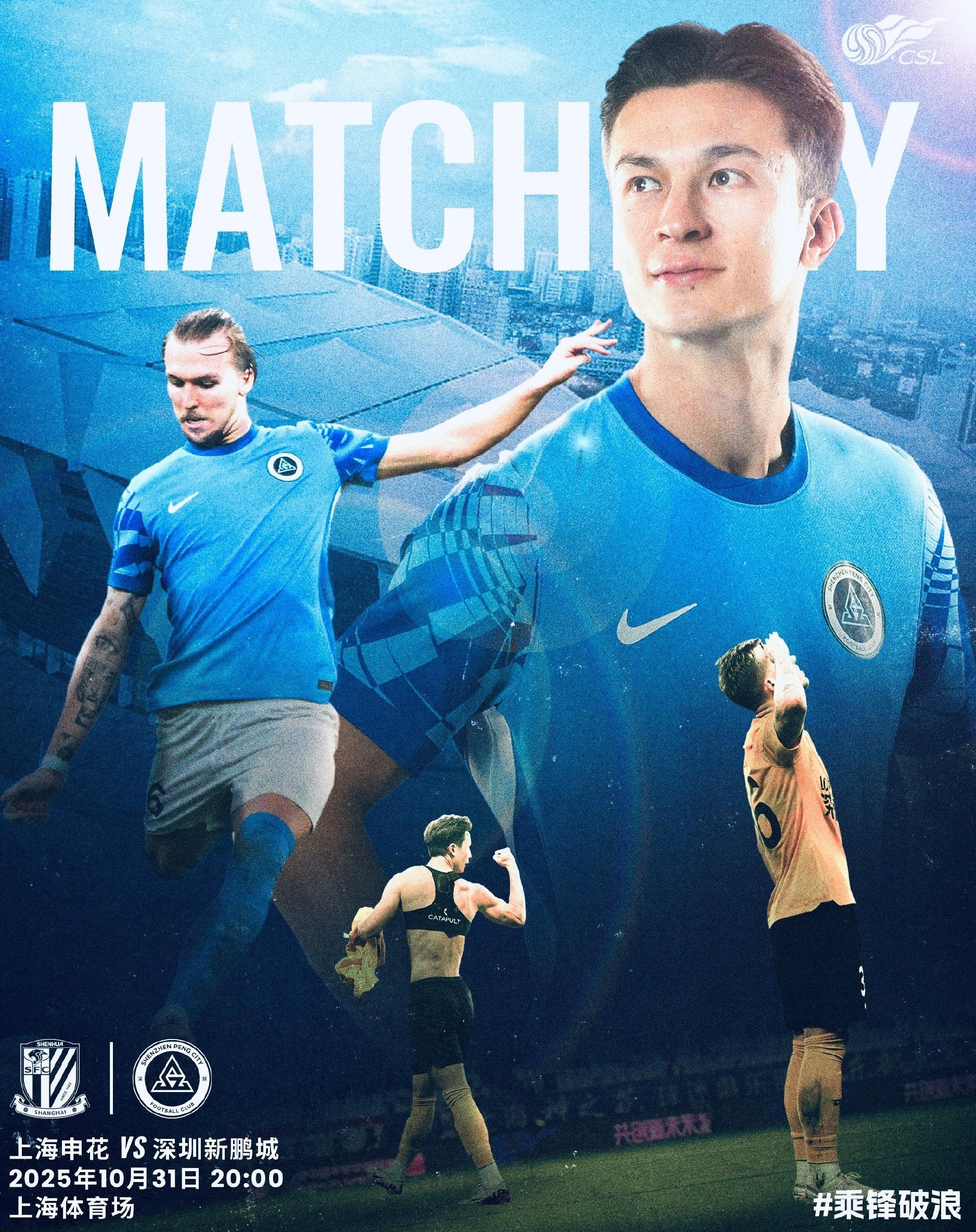 10月31日(星期五)20:00,2025赛季中超联赛第29轮将迎来一场焦点战——深圳新鹏城客场挑战上海申花。10月29日,深圳新鹏城官方发布了本场比赛的赛事海报,主题为“乘锋破浪,沪上耀鹏光”,彰显了球队客场争胜的决心。