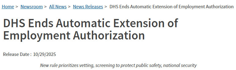 美国国土安全部(DHS)10月29日发布声明,宣布在就业授权文件(EAD,俗称工卡)持有者申请续期期间,将不再自动延长其工卡的有效性。根据新规,一旦旧工卡到期,即使申请人已提交续期申请,也必须立即停止工作,直至新工卡正式获批。