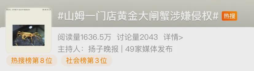 10月27日晚,张家港山姆会员店负责人表示,所有供应商材料已提交市场监管部门,法务团队正在研判侵权认定。为避免争议扩大,该款"黄金大闸蟹"产品已紧急下架处理。