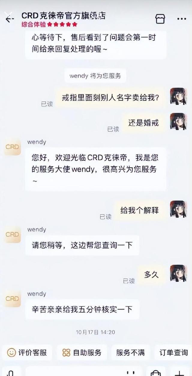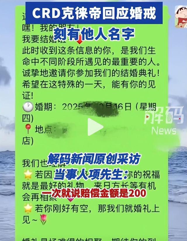 10月16日,项先生刚结束婚礼,本应沉浸在幸福中的他,却意外发现交换的婚戒里藏着陌生人的名字。原来,婚礼前10月初,他在CRD克徕帝官方旗舰店花费1760元购买了一对素金婚戒,婚礼当天使用并未察觉异常。