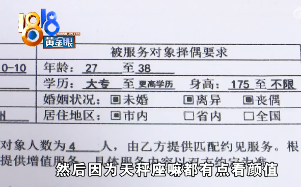 去年12月,邱女士与杭州一家婚介公司签订了服务合同,服务费1万元,合同约定为她匹配4位合适的对象。邱女士表示,她希望找的对象年龄差在10岁以内,长相年轻好看,且在杭州本地有房有车,工作稳定。