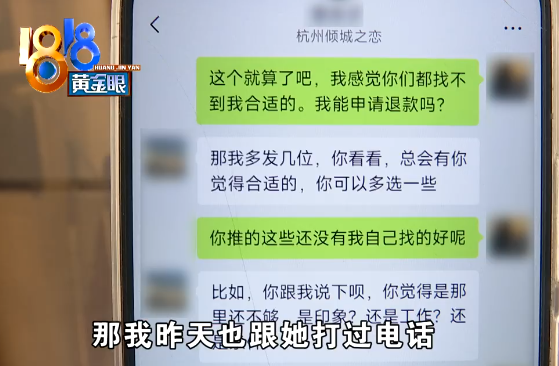 见了三人后,邱女士便要求结束服务,并希望婚介公司能够退还5万元服务费。她表示,整个服务过程中她都不是很满意,唯独见的第一位男士还稍微满意些,后续都是自己不愿意见、婚介公司让她去见的。