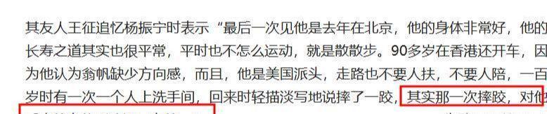 据杨振宁的友人透露,百岁那年,杨先生独自上洗手间时不慎摔了一跤。尽管他事后轻描淡写,但这次意外对他的身体造成了深远影响。北京老年医院的专家指出,对于80岁以上的老人而言,跌倒绝非小事,甚至可能成为与死神交手的开端。