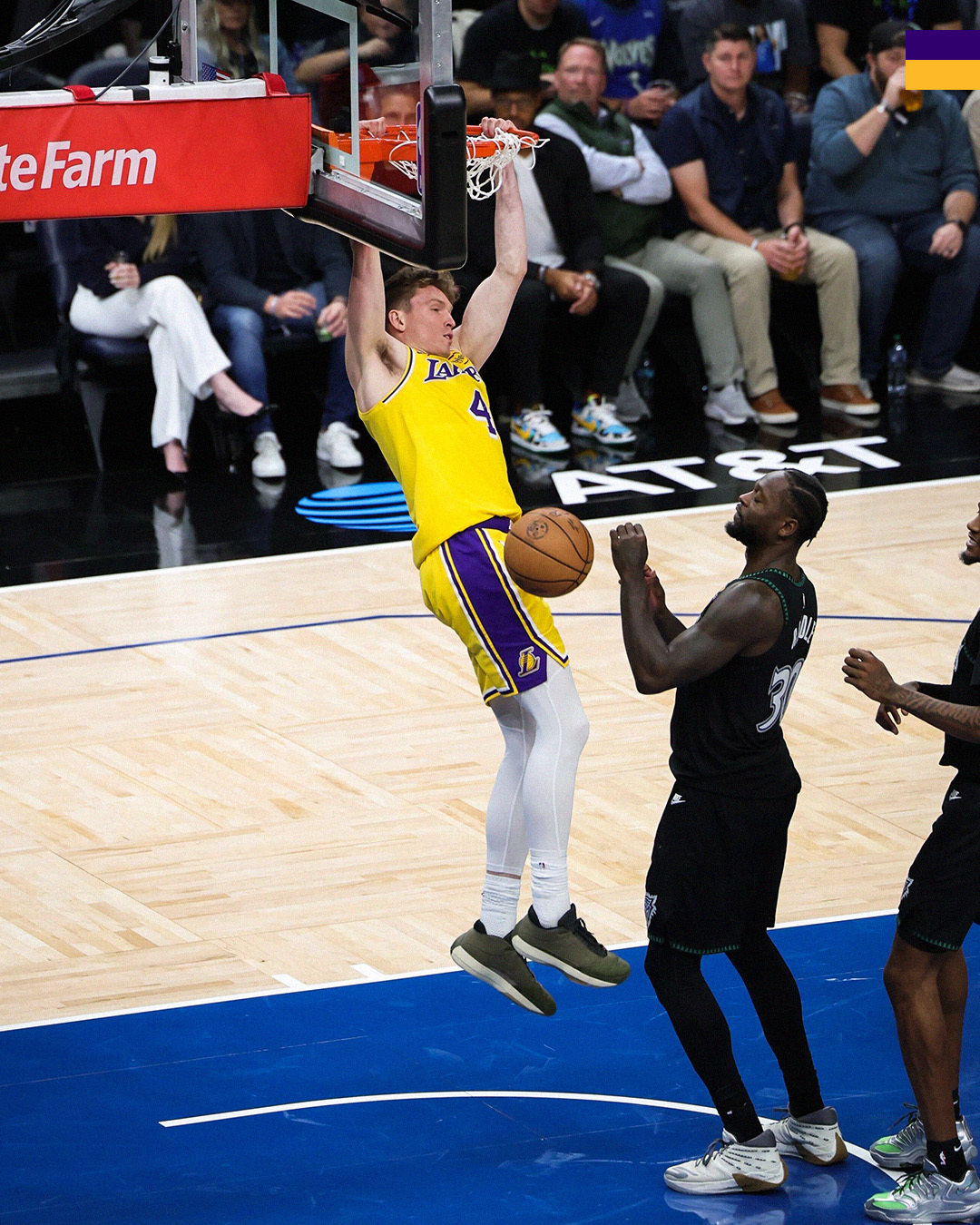 第三节成为转折点,拉拉维亚单节狂轰11分率队打出12-0高潮,湖人一度领先20分(79-65)。但森林狼在麦克丹尼尔斯和海兰德带领下回敬11-2攻势,三节战罢仍以86-97落后。末节决战,迪文琴佐和兰德尔连续追分,最后10.2秒兰德尔突破反超比分(115-114),然而里夫斯用一记压哨突破上篮完成绝杀,最终湖人1分险胜。