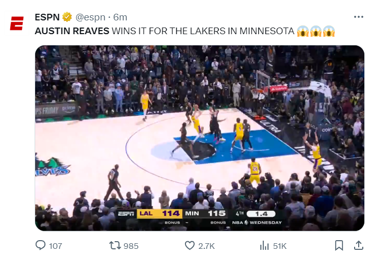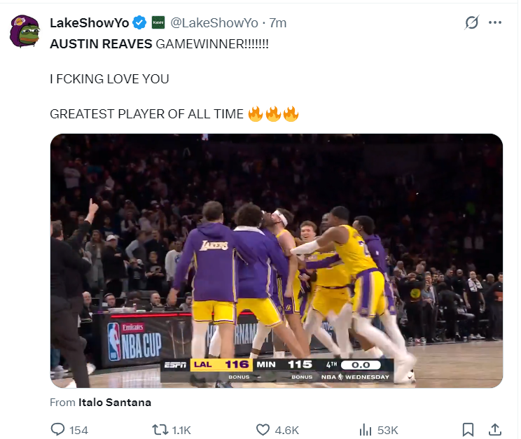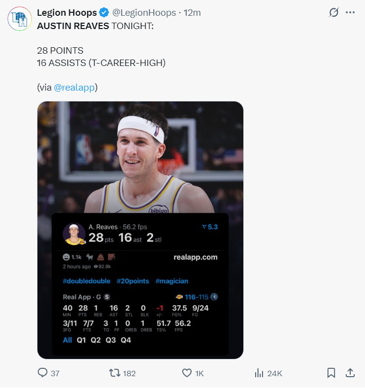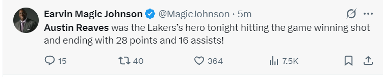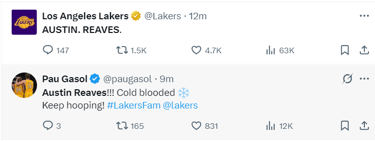 湖人名宿魔术师约翰逊赛后第一时间发推盛赞:"里夫斯是今晚的英雄!28分16助攻加绝杀,这就是超级巨星的表现!"湖人官方社交媒体也简单直接地发布"奥斯汀-里夫斯"的名字,表达对球员的敬意。前湖人球星大加索尔则鼓励道:"继续投篮吧,Keep Hooping!"