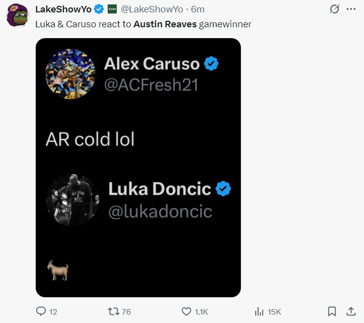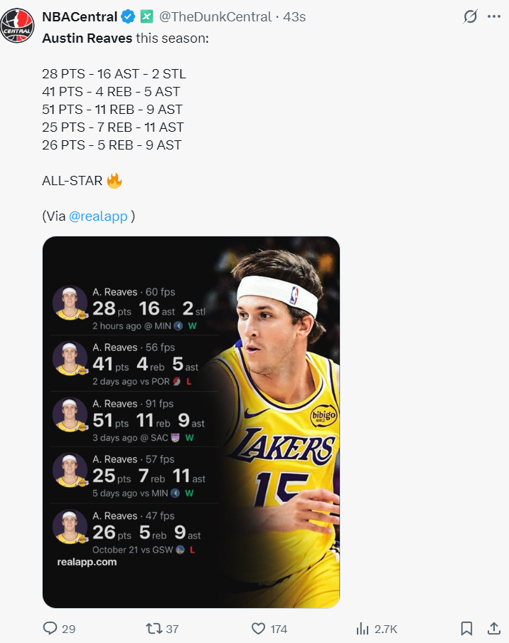 美媒统计了里夫斯本赛季开赛阶段的爆炸数据:26分9助攻5篮板、25分11助攻7篮板、51分11篮板9助攻、41分5助攻4篮板、28分16助攻2抢断,高呼其已具备全明星水准。独行侠球星东契奇在IG转发了绝杀视频,并配文"GOAT(历史最佳)",卡鲁索也点赞了这条动态。