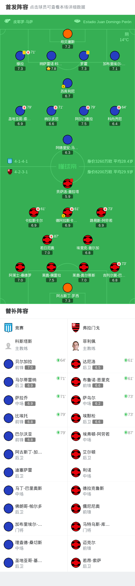 竞赛队排出4-3-3攻击阵型,锋线由卡斯蒂列霍领衔,中场核心罗梅罗坐镇调度。弗拉门戈则以4-2-3-1应战,前巴萨球员阿图尔搭档吉马良斯组成双后腰,前场依靠佩德罗的冲击力制造威胁。两队主帅均未因首回合比分保守,而是选择主动出击争取晋级先机。