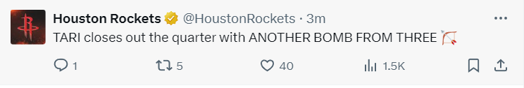 第三节成为伊森的表演时刻,尽管开局出现离谱失误——运球时滑倒出界,但他很快用行动完成救赎。当第三节还剩2.1秒时,伊森在左侧底角接球,面对防守球员的贴身紧逼,他果断出手命中压哨三分。这个关键进球帮助火箭将分差扩大到15分,彻底奠定胜局。火箭官方社交媒体特意发文称赞:"伊森在第三节末的致命三分,为比赛画上完美句号!"