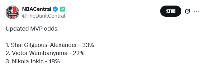 在常规赛MVP的竞争格局中,雷霆核心亚历山大以33%的概率暂居榜首,文班亚马以22%的概率位列第二,掘金中锋约基奇则以18%的概率排名第三。尽管与榜首存在差距,但这位20岁的法国天才已展现出冲击顶级荣誉的强劲势头。