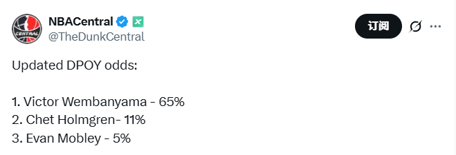 DPOY奖项的争夺则呈现一边倒态势。文班亚马以65%的压倒性概率领跑榜单,雷霆新秀霍姆格伦以11%排名第二,骑士内线莫布利5%位列第三。这种断层式领先,印证了文班亚马在防守端的统治力。