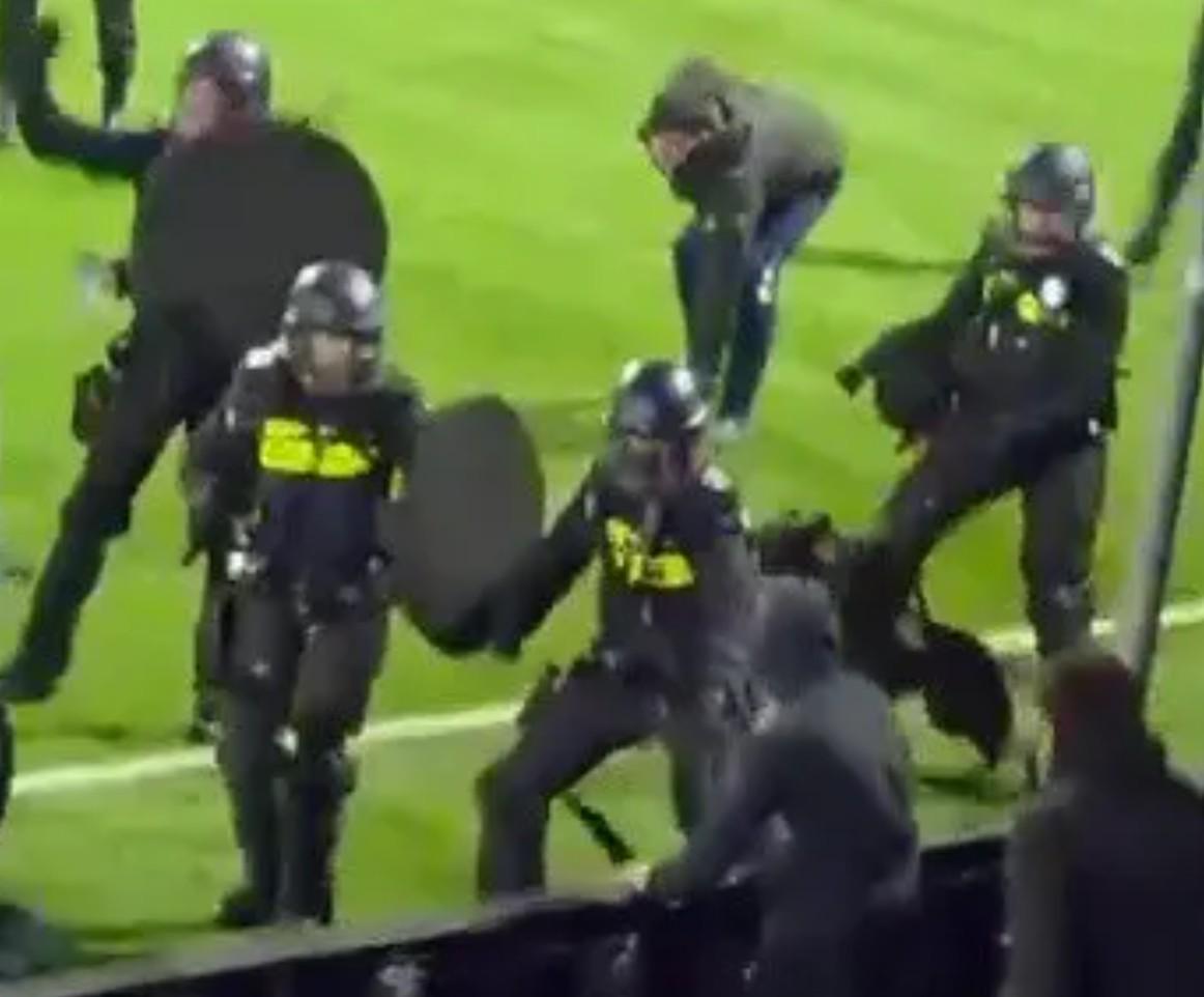 为尽快控制事态,防暴警察迅速进入场内,通过使用警棍和警犬驱散人群。现场视频显示,一名闹事球迷被警犬咬伤腿部,而据后续报道,一名安保人员也在混乱中被警犬误伤手部。