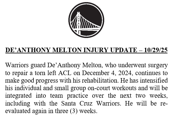 据勇士队官方发布的伤情更新,梅尔顿正在从去年遭遇的前交叉韧带撕裂伤势中稳步恢复,目前康复情况“十分良好”。近期,他已经增加了训练强度,并开始参与个人训练和小团体训练。球队计划在未来几周内,逐步将他纳入球队合练,包括NBA主队和发展联盟的圣克鲁斯勇士队的联合训练。