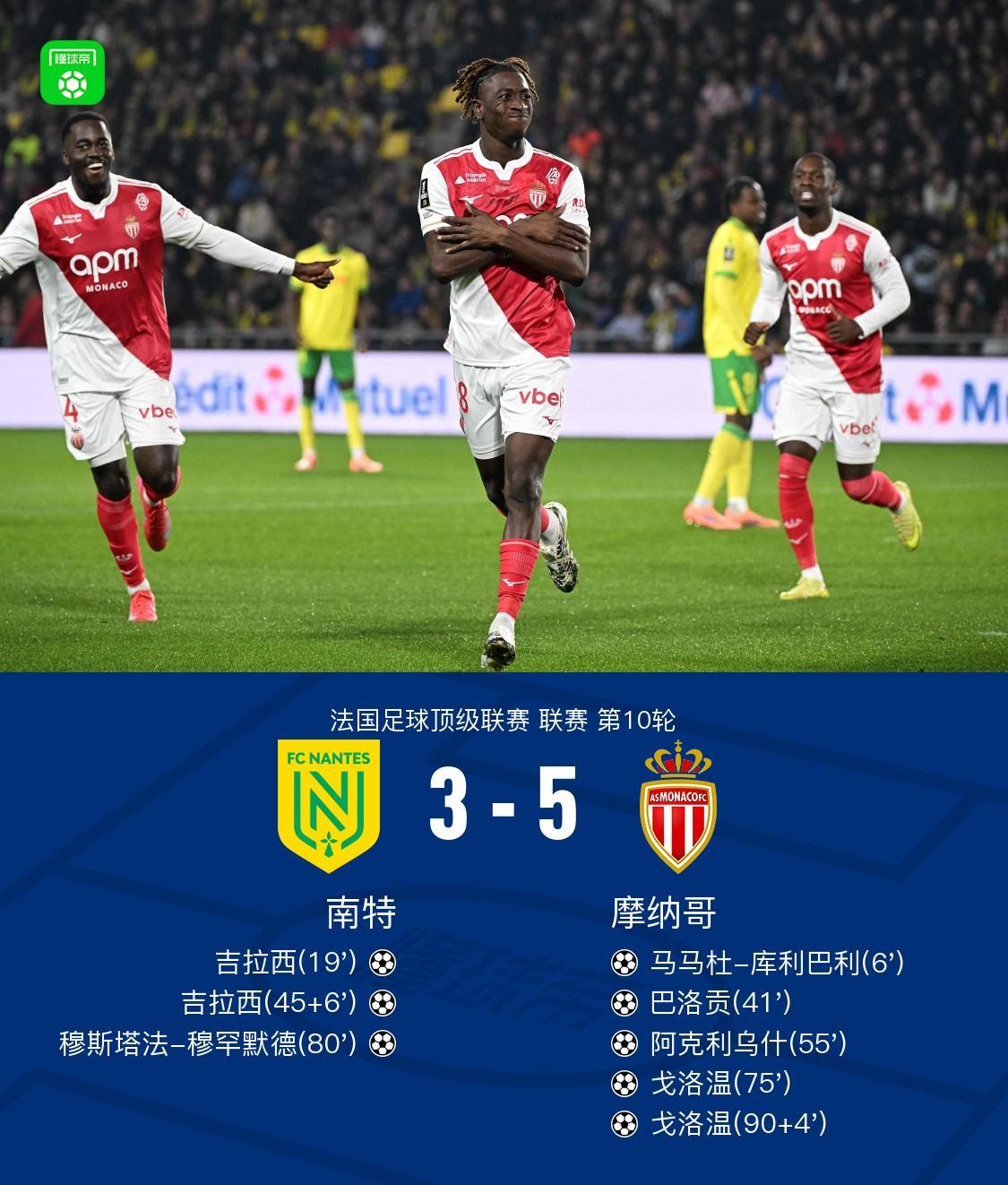北京时间10月30日,法国足球顶级联赛第10轮迎来一场焦点对决,南特坐镇主场迎战摩纳哥。本场比赛双方上演进球大战,最终摩纳哥凭借戈洛温的梅开二度以及库利巴利的传射表现,以5-3客场力克南特。南特方面,吉拉西同样完成双响,穆斯塔法-穆罕默德也有一球入账。