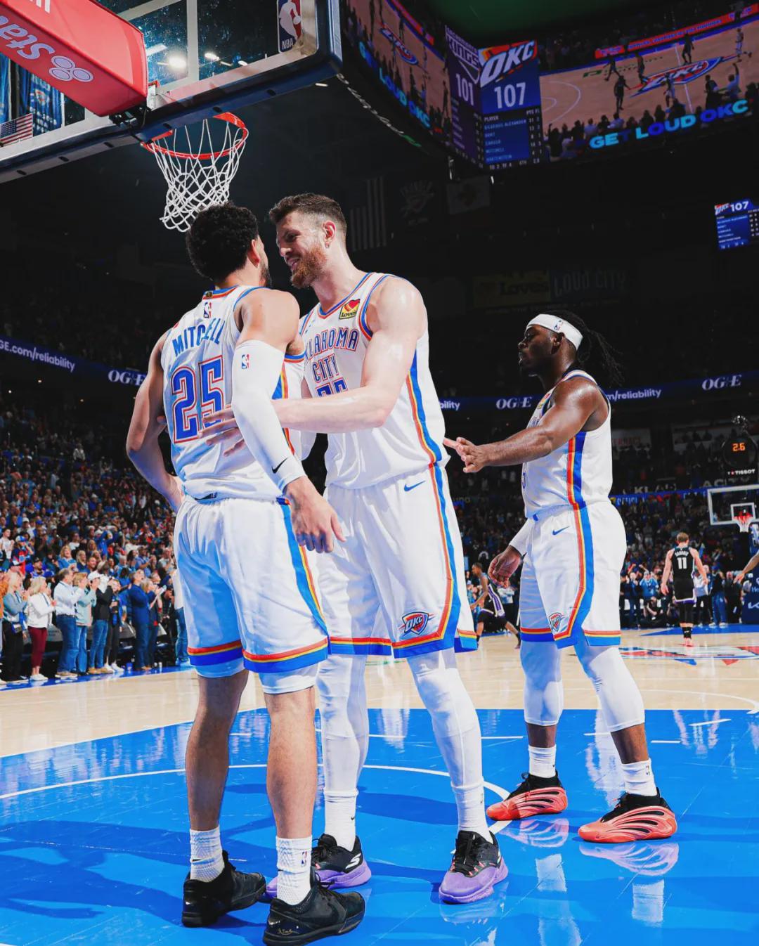 开赛至今,阿杰伊-米切尔在场均26.6分钟的出场时间里,能够贡献18.2分3.8篮板3助攻1.2抢断,这效率简直惊人。这位左撇子球员已经凭借自己的冷静、高效、意识、努力和执行力,赢得了队友和教练的绝对信任。当他在场时,雷霆的进攻大多数由他发起,亚历山大上来给他挂掩护是雷霆的常规战术起手式。