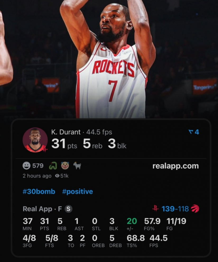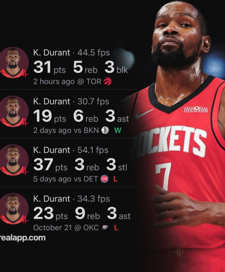 杜兰特虽在火箭139-121大胜猛龙的比赛中轰下31分5篮板1助攻3盖帽,正负值+20统治末节,却因里夫斯的绝杀神话无缘当日最佳。但死神依旧书写着属于自己的传奇: