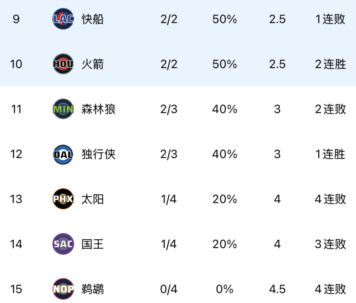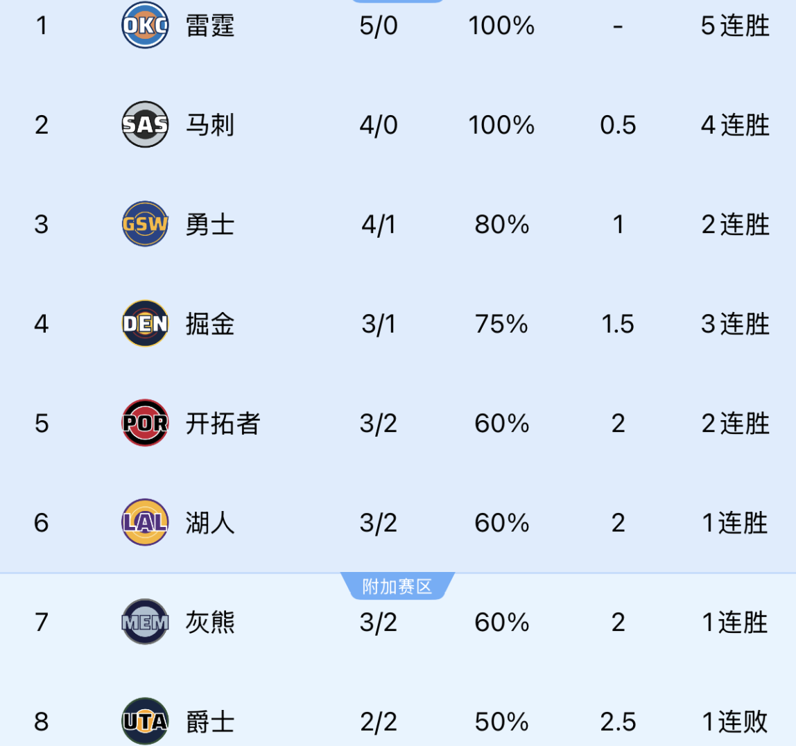 在最新的西部排行榜上,5连胜的雷霆和4连胜的马刺分列前两位,开拓者升至第5位。太阳因四连败排名下滑,而鹈鹕成为西部唯一未尝胜绩的球队,开局四战全败。