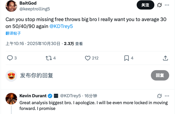 面对球迷的吐槽,杜兰特展现出了他的大度和专业,直接回复道:“很专业的分析,兄弟。很抱歉,我保证我后面会更专注,全力以赴。”杜兰特的回应,不仅体现了他对球迷意见的重视,更展现了他对自我提升的坚定决心。