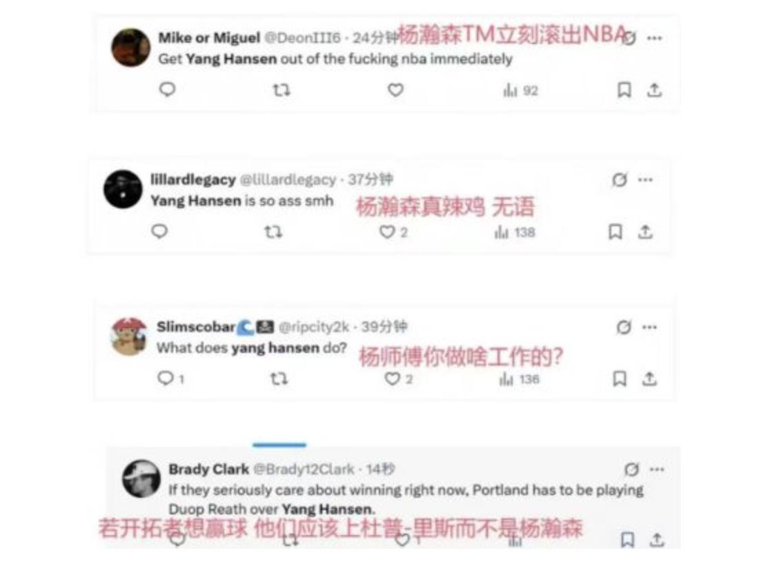 这些球迷的留言无疑有些伤人且过分。要知道,在之前的夏季联赛和季前赛中,许多国外球迷还是对杨瀚森表示认可的。然而,随着最近几场常规赛中杨瀚森表现的低迷,很多外国球迷可能逐渐失去了耐心。他们曾认为杨瀚森被16顺位选中是开拓者的幸运,但现在却开始担心他可能会成为水货,甚至认为开拓者在首轮选中他并不值得。