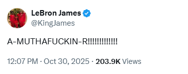 哦对了,差点忘了,队里还有东契奇和詹姆斯两位巨星没打呢。不敢想象,如果两人回归,湖人的战力又会是怎样一个级别。说起来,里夫斯今天这记绝杀,可是把詹姆斯都给看嗨了,他直接在网上发推飙起了脏话:“A-MF-R”,足以见得他对里夫斯表现的激动之情。