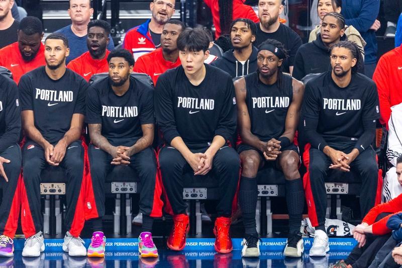 新华社照片显示,开拓者队球员杨瀚森(中)与队友在替补席观战。