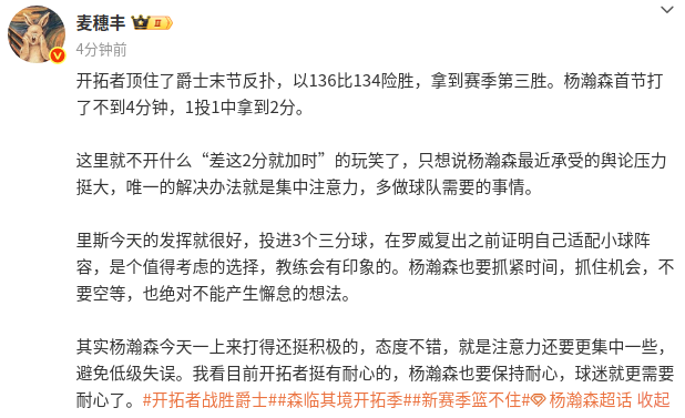 知名体育博主麦穗丰在社交媒体发文点评称:“杨瀚森今日上场后展现出的积极性值得肯定,但注意力集中度仍需加强,避免出现低级失误。”他特别提到,当前舆论环境对年轻球员压力巨大,而专注力提升是化解压力的关键。