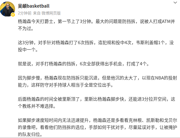 雷速体育10月30日讯,在今日NBA常规赛开拓者对阵爵士的比赛中,中国球员杨瀚森的防守表现引发了广泛讨论。知名篮球博主“吴頔basketball”在社交媒体发文指出,杨瀚森若无法在短期内提升脚步速度,需通过研究特定球员的防守录像来改进技术。