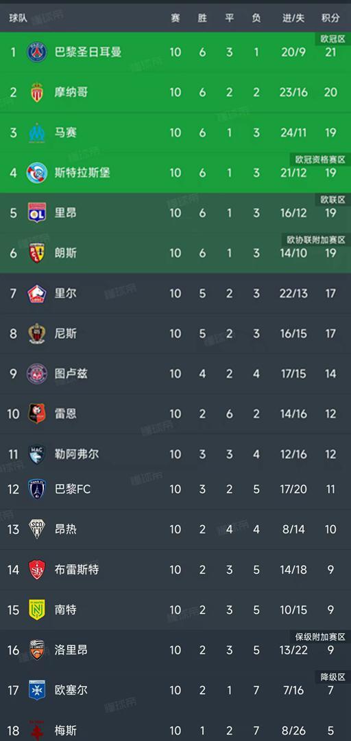 北京时间10月30日,法甲第10轮比赛全部落下帷幕,本轮过后积分榜格局发生显著变化。卫冕冠军巴黎圣日耳曼的领先优势大幅缩水,而摩纳哥、马赛等队则紧追不舍,联赛竞争进入白热化阶段。以下是本轮焦点战况及最新积分榜解析: