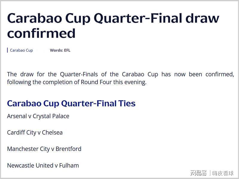 根据联赛杯官网的消息,八强对阵形势已确定:阿森纳将面对水晶宫的挑战;卡迪夫城则将迎战切尔西;曼城将对阵布伦特福德;卫冕冠军纽卡斯尔则将与富勒姆展开激战。所有比赛均安排在12月17日的那个周中进行,具体比赛时间待定。