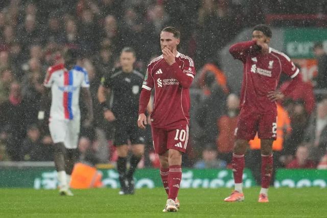 利物浦在联赛杯赛场遭遇重创,主场0-3惨败于水晶宫脚下,止步16强。这场失利不仅让红军各项赛事近7战输掉6场,更创下自1934年2月足总杯0-3负于博尔顿以来,安菲尔德球场国内杯赛最大比分失利纪录。主帅斯洛特此役大幅轮换阵容,伍德曼与基兰·莫里森完成一线队首秀,但这一决策引发巨大争议。