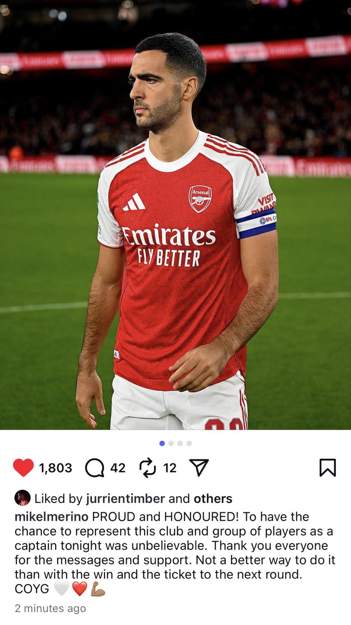 雷速体育10月30日讯 在今日凌晨结束的英联杯赛事中,阿森纳坐镇主场以2-0的比分战胜布莱顿,成功晋级下一轮。赛后,球队中场大将梅里诺通过社交媒体分享了自己的喜悦与感慨。