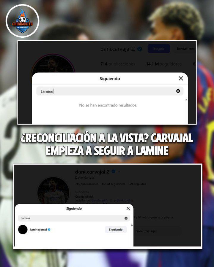 雷速体育10月30日讯 近日,西班牙电视节目《El Chiringuito》的一则报道引发了广泛关注。据报道,在国家德比结束后,皇马队长卡瓦哈尔在Instagram上主动关注了巴萨新星亚马尔,这一举动迅速成为外界热议的焦点。