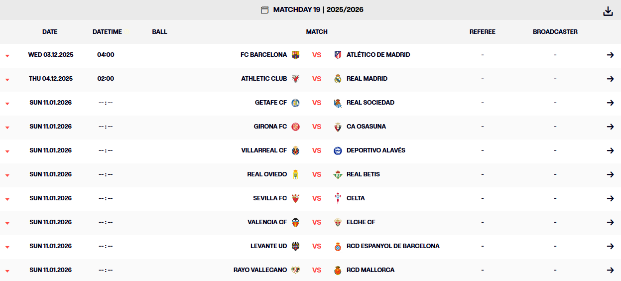 雷速体育10月30日讯 近日,西甲联赛官方宣布了一项重要赛程调整。由于马德里竞技、巴塞罗那、毕尔巴鄂竞技以及皇家马德里四支球队将共同参加明年1月举行的西班牙超级杯,为避免赛程出现冲突,西甲第19轮的部分比赛不得不提前进行。