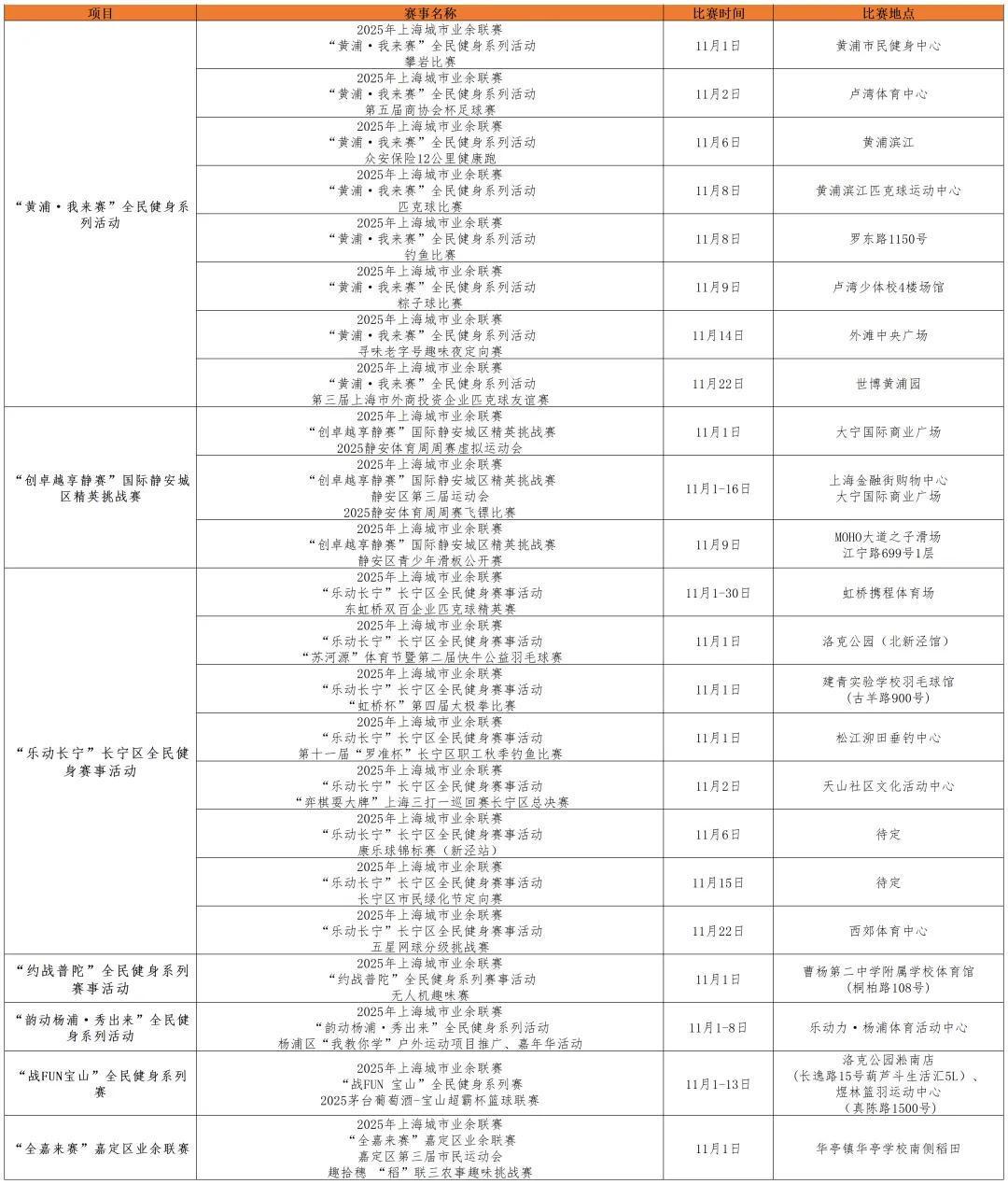 深秋的冷空气席卷而来,但申城的运动热情却丝毫未减!随着2025年上海城市业余联赛的持续升温,11月赛事目录已新鲜出炉,为市民们带来一场场精彩纷呈的体育盛宴。快跟随我们的脚步,一起探索这份赛事全攻略,释放你的运动活力,共赴热爱之约!