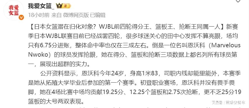 在今年的WJBL联赛上,恩沃科表现抢眼,场均砍下19.2分12.5板以及2.7抢断,攻防两端均展现出全面实力。她还有过单场25分19板的壮举,目前是日本联赛的得分王、篮板王以及抢断王,堪称日本联赛最炙手可热的球员。如果恩沃科真的被日本队归化,无疑将极大提升日本女篮的内线实力。