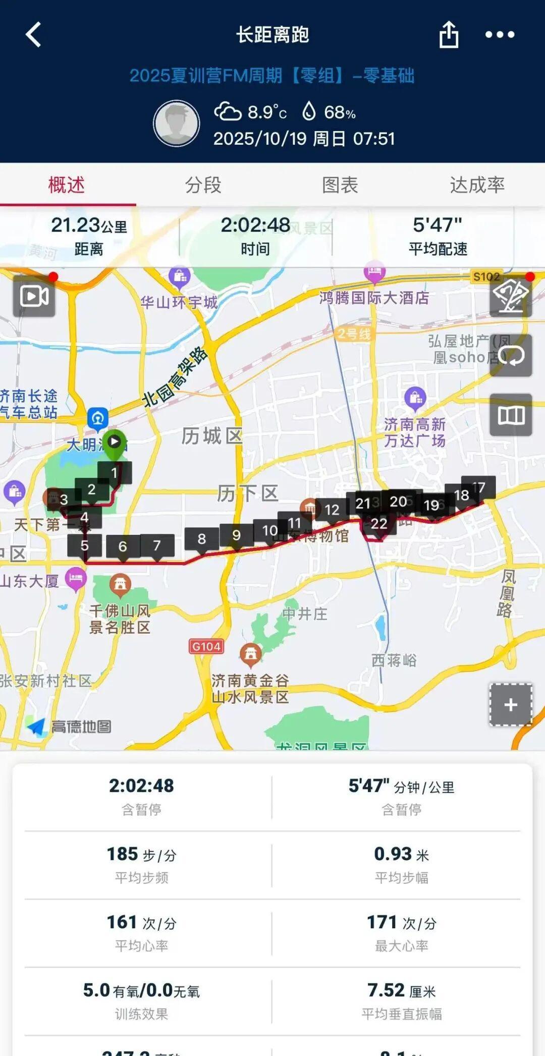 前两公里本计划按教练指导的配速策略行进,但重返故土的兴奋与赛前特饮的作用,让我的状态出奇地好。首公里6:47的配速尚在计划内,第二公里便提升至6:18。当配速在四公里后稳定在5:52左右时,我意识到济南赛道的特殊挑战——终点海拔较起点高出百余米,途中更是布满起伏的长缓坡。
