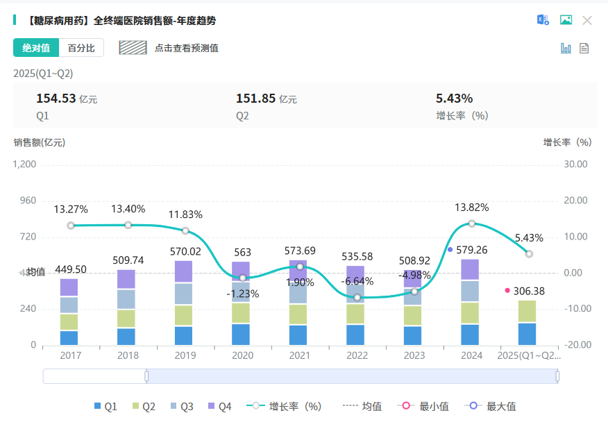 糖尿病已成为继肿瘤、心脑血管疾病之后,第三大严重危害人类健康的慢性疾病。根据国际糖尿病联盟第11版数据,中国成人糖尿病患病率高达13.79%,患者数量达1.48亿,稳居全球糖尿病第一大国。据摩熵医药数据库(https://vip.pharnexcloud.com/?zmt-mhwz)显示,2024年糖尿病用药在中国全终端医院的销售总额突破500亿元,同比增长13.82%,市场潜力巨大。