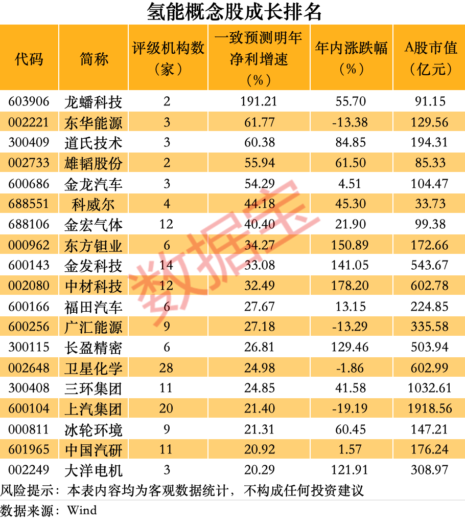 成长性方面,19只概念股获机构预测明年净利润增速超20%。其中龙蟠科技以191%的增速领跑,东华能源、道氏技术、雄韬股份等增速均超50%。