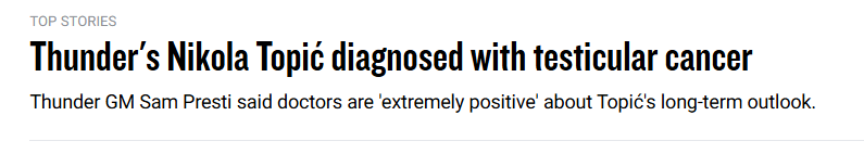 在雷霆对阵奇才的比赛开始前,普雷斯蒂向记者详细更新了托皮奇的病情。他表示:“当时必须通过手术进行活检,现在活检结果已经出来,他被确诊患有睾丸癌。不过,值得庆幸的是,他在俄克拉荷马大学医学中心和MD安德森癌症中心都有非常专业的肿瘤医生团队,他们对他的治疗前景非常乐观。需要强调的是,睾丸癌是男性所有癌症类型中治愈率最高的一种。”