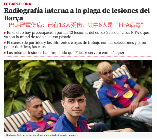 《世界体育报》分析指出,"FIFA病毒"是导致伤病频发的主因。统计显示,亚马尔、奥尔莫、德容、莱万、费兰-托雷斯和特尔施特根6人均是在国家队赛事期间受伤。巴萨管理层对此表达强烈不满,认为西班牙足协和荷兰足协在球员疲劳或带伤情况下仍安排出场,直接导致伤势加重。