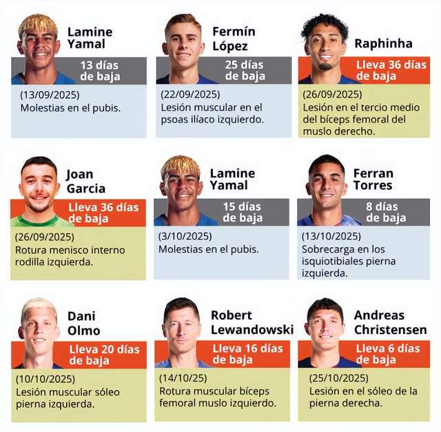 目前巴萨一线队23人中,仍有8人在养伤:霍安-加西亚、特尔施特根、克里斯滕森、佩德里、加维、奥尔莫、拉菲尼亚和莱万多夫斯基。18岁新星亚马尔虽未列入正式伤病名单,但耻骨炎导致的剧烈疼痛已严重影响其竞技状态,成为潜在隐患。