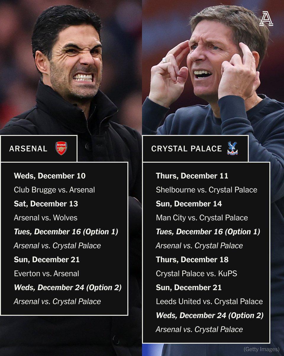 <当前最棘手的问题在于英联杯四分之一决赛的赛程安排。由于半决赛首回合定于1月12日所在周进行,而双方又要在1月10-11日参加足总杯第三轮,导致这场关键对决的日期陷入两难境地。目前有两个候选方案:要么安排在12月16日(这意味着水晶宫将在8天内完成4场比赛),要么放在平安夜(12月24日)进行。