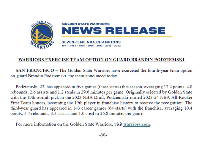 北京时间10月31日,金州勇士队官方正式宣布,已执行后卫波杰姆斯基(Podziemski)2026-27赛季的新秀合同球队选项。这一决定被视为勇士管理层对这位年轻后卫未来发展的坚定信心,同时也为球队未来的薪资结构调整预留了灵活性。