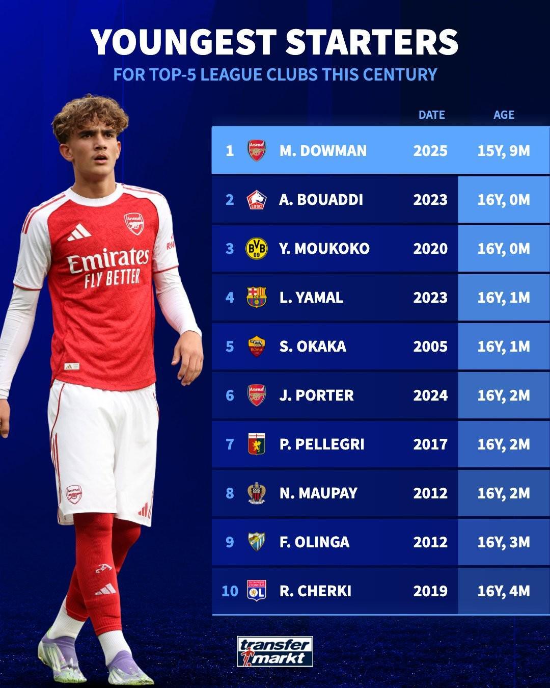 近日,权威数据机构德国转会市场(德转)发布了本世纪欧洲五大联赛俱乐部最年轻的首发球员排行榜。这份榜单记录了21世纪以来,在英超、西甲、德甲、意甲和法甲中以最小年龄完成联赛首发的十位天才少年。其中,阿森纳新星道曼以15岁零9个月的惊人纪录登顶榜首,巴塞罗那天才亚马尔位列第四。