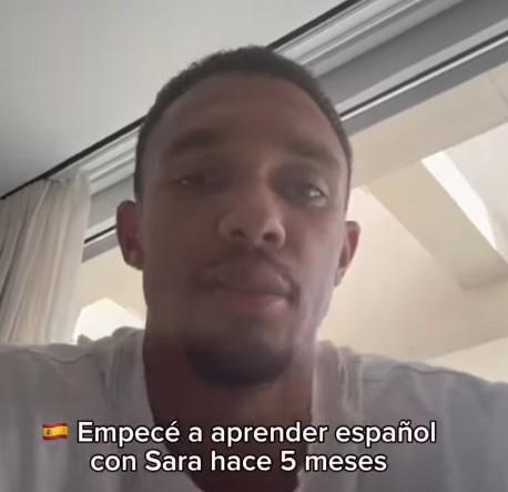 在Sara Duque分享的视频中,阿诺德先用英语表达了自己的学习初衷:“我和Sara从五个月前开始学习西班牙语,因为我渴望更好地与我的队友、教练以及球迷沟通,同时也希望更深入地适应当地的文化。”