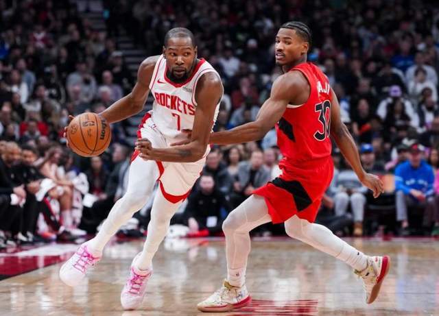 调整后的火箭阵容更趋合理,杜兰特的加盟成为关键转折点。这位超级得分手以53%的命中率场均贡献27.5分5.8篮板2.0助攻,其攻坚稳定性堪称“人类50%命中率精华”。在范弗里特缺阵的情况下,申京承担起组织重任,与杜兰特产生的化学反应远超预期。数据显示,当两人同时在场时,火箭百回合净胜对手19.1分,其中进攻效率高达联盟第一的131.9,防守效率也稳居联盟第13。