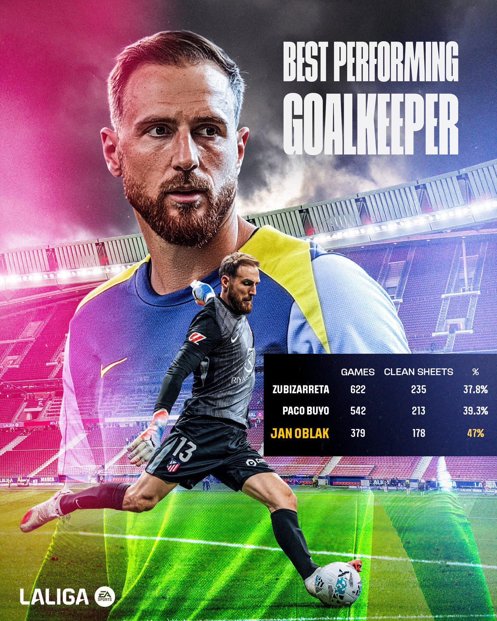 凭借本场比赛的零封表现,这位斯洛文尼亚国门正式以178场零封跻身西甲历史零封场次第三多的门将行列。在他身前,仅有传奇门将苏比萨雷塔(Andoni Zubizarreta)的233场和帕科·布约(Paco Buyo)的190场零封纪录尚未被打破。
