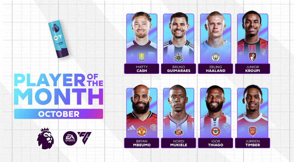雷速体育10月30日讯 近日,英超官方正式公布了10月份最佳球员的候选名单,多位在本月表现突出的球员成功入围。其中,备受瞩目的挪威锋霸哈兰德、布伦特福德边锋姆伯莫、阿森纳后卫廷贝尔以及纽卡斯尔中场吉马良斯等球员均榜上有名。