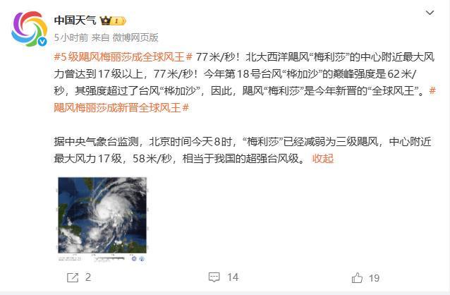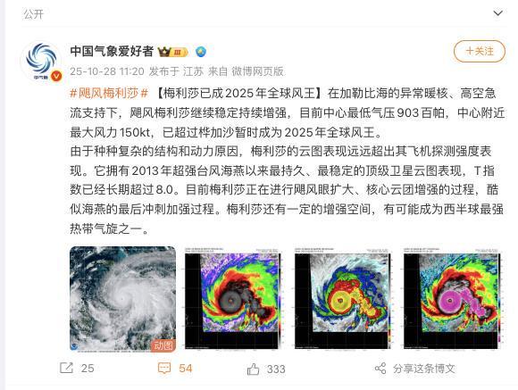 据中国天气最新消息,北大西洋飓风“梅利莎”以惊人的强度刷新历史纪录——其中心附近最大风力曾达到17级以上,风速高达77米/秒,一举超越今年第18号台风“桦加沙”(巅峰强度62米/秒),成为2025年新晋的“全球风王”。