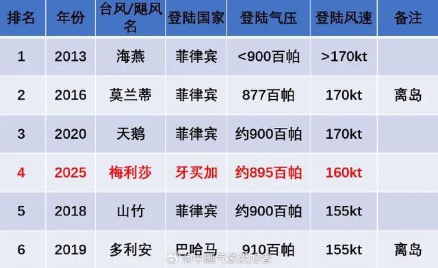 根据对2011年以来15年数据的分析,飓风“梅利莎”的强度在全球登陆台风/飓风中可排第四位,稳居西半球第一。其中心气压低至895百帕,这一数据仅次于历史上两个更强的北大西洋飓风。气象学家指出,气压越低,飓风破坏力越强,“梅利莎”的低压值使其成为近十年最危险的飓风之一。