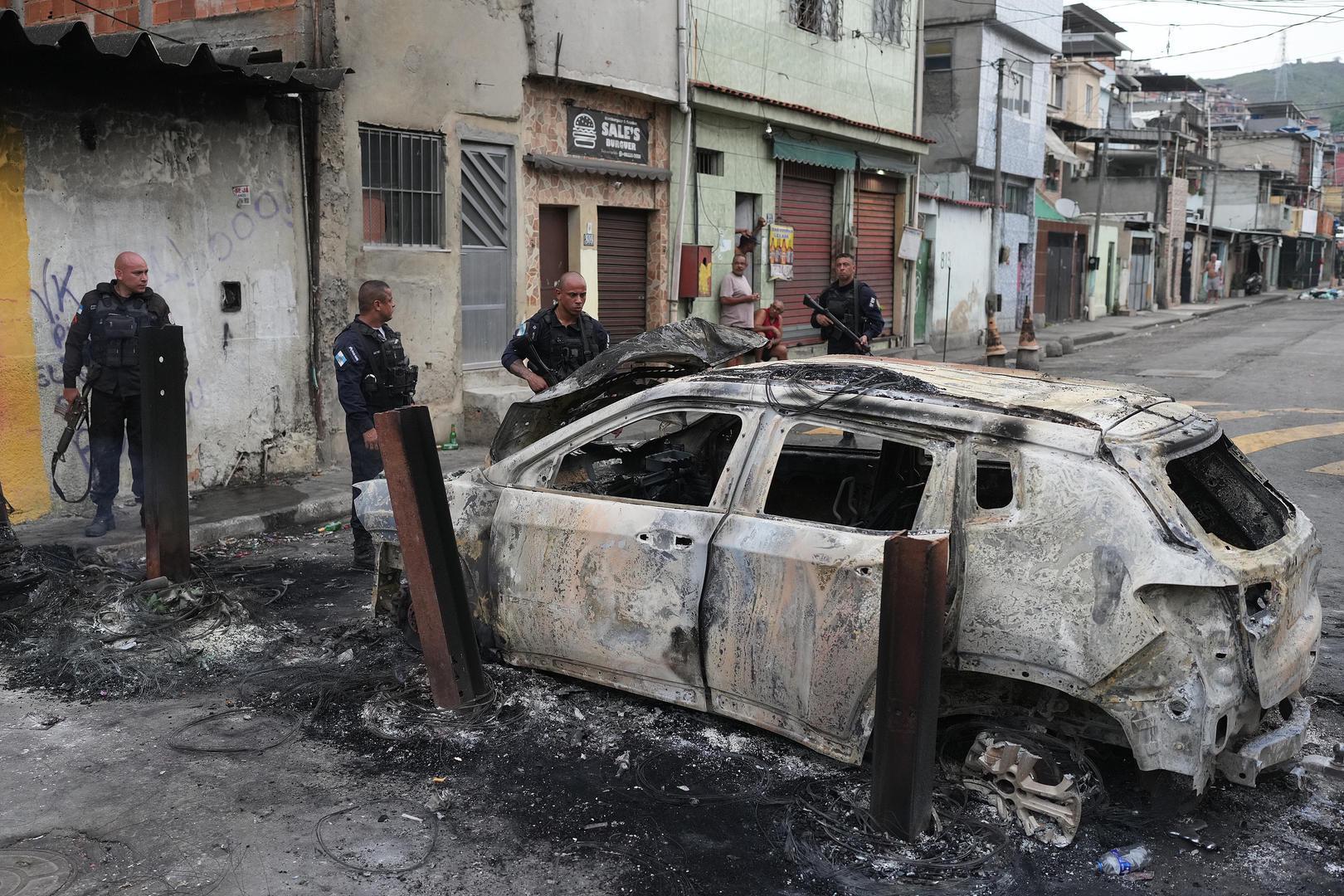 10月28日,里约热内卢警察查看一辆被焚毁的汽车 图据视觉中国